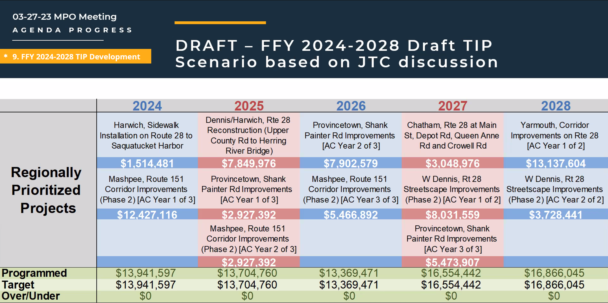 “MassDOT also recommends pushing back the Provincetown Shank Painter Road project from FFY2024 to 2025 as this project is behind schedule.”